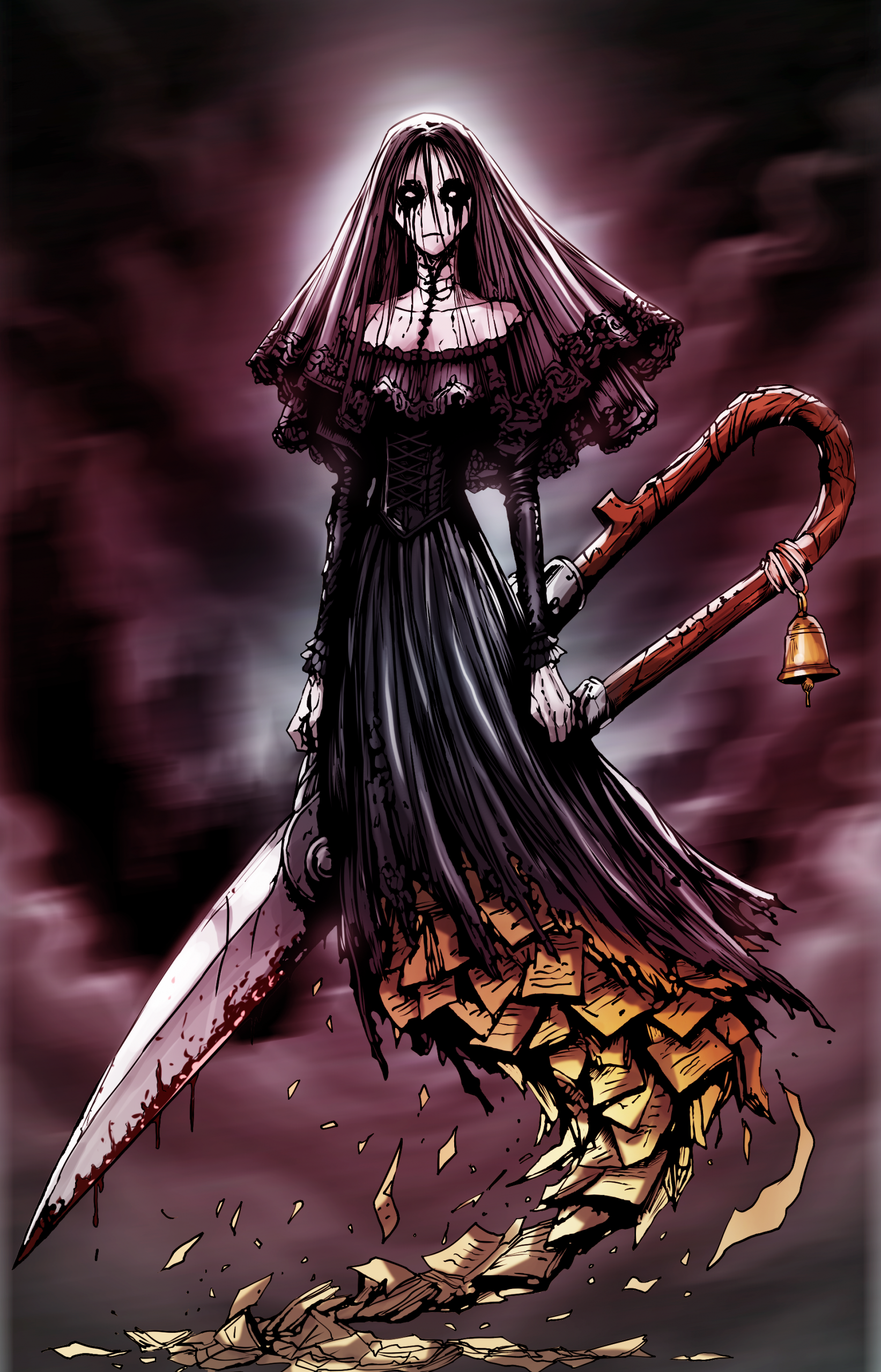She’s the antagonist of Whispers of Blackwood Manor, and without her death scene, she is unstoppable. Bone-thin, wrapped in torn black fabric, and hiding behind a cracked porcelain mask, she is terrifyingly calm. She doesn’t rage. She just walks the aisles with her massive iron shears, snipping spines and stitching her own wounds back together with moving text.